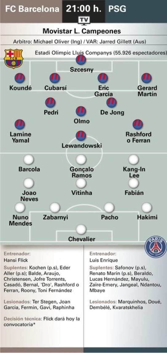 根据《世界体育报》的预测,巴萨和巴黎的首发阵容分别为: