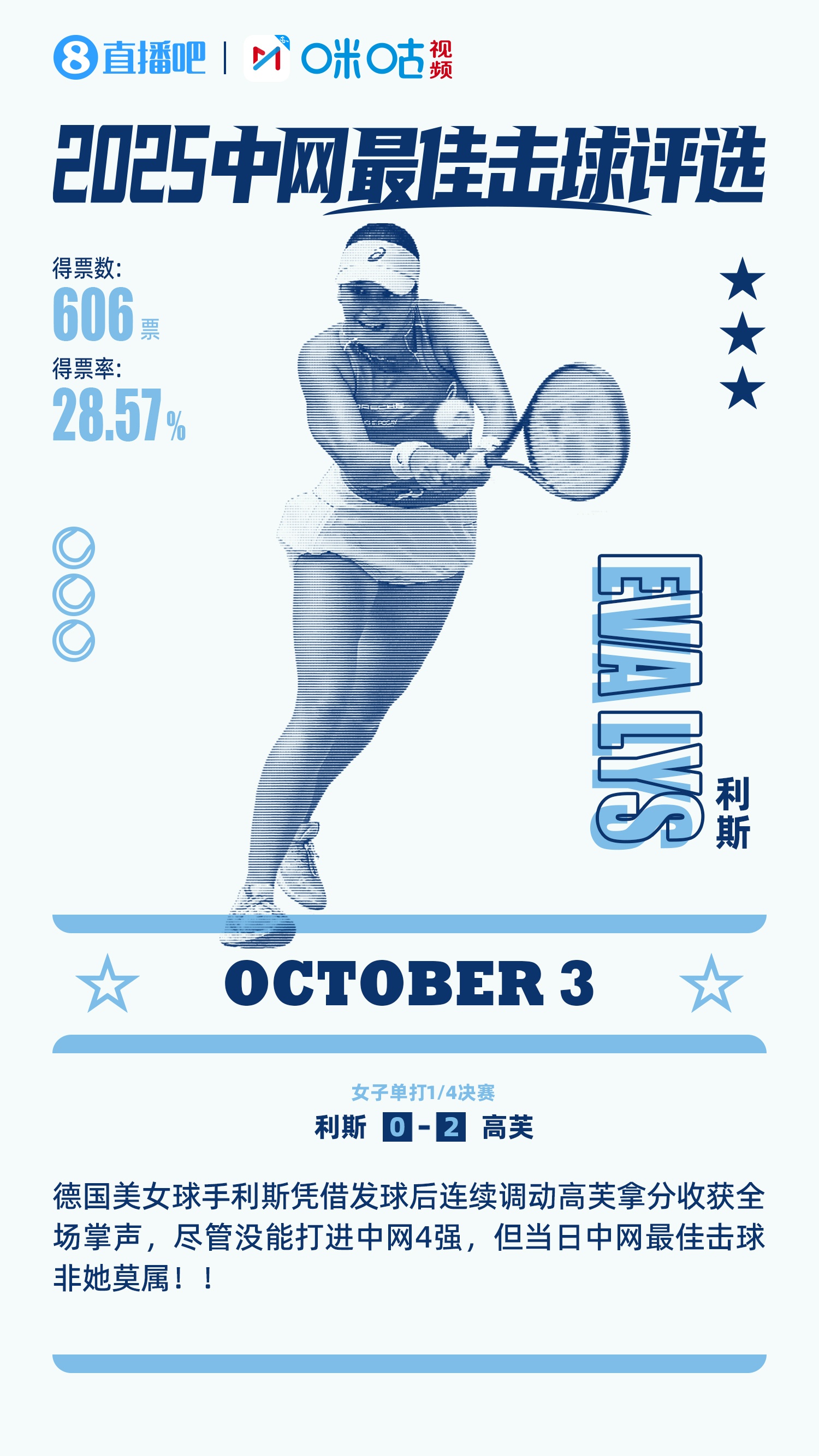 在10月3日的投票中,利斯以一记精彩的发球拉动了高芙的防守,成功得分,获得了28.57%的吧友投票,荣获当日的#中网最佳击球#。这样的发挥不仅展现了利斯的技术水平,也让观众看到了比赛的激烈程度。