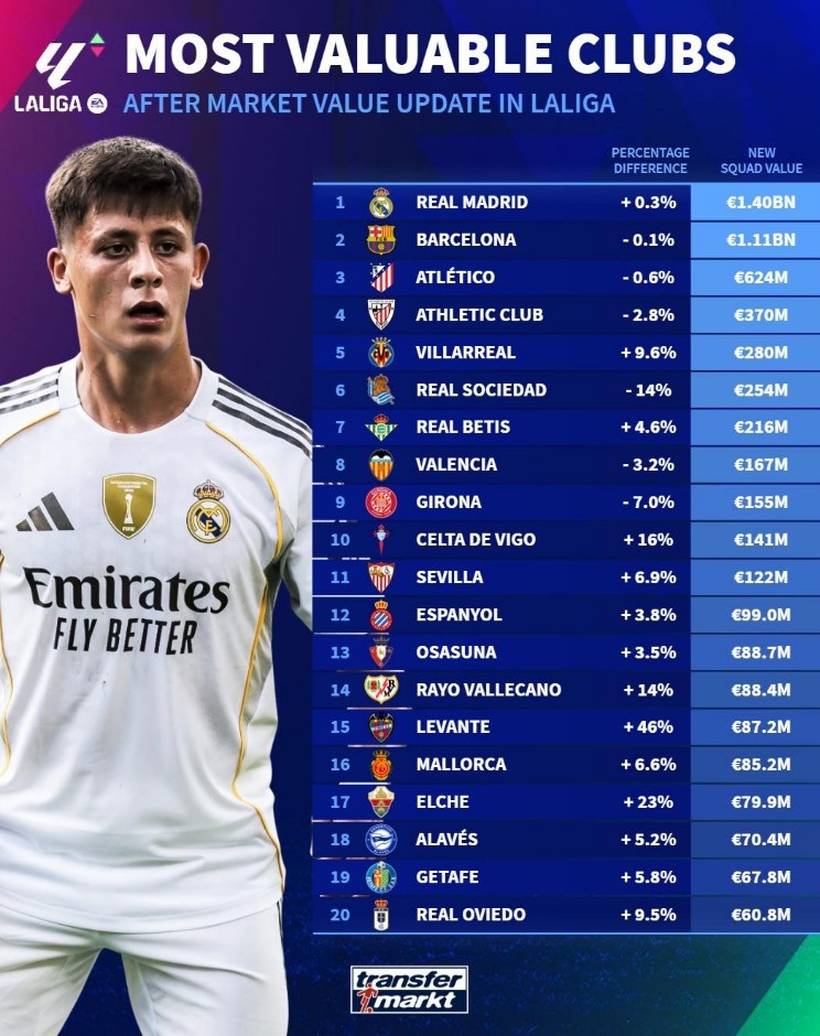 在西甲的舞台上,身价的荣誉榜上闪耀着众多的传奇与新星。这是一个汇集了明星与梦想的联盟,而最新的评估揭示了各队的市场价值分布。首先,闯荡欧洲、深受球迷喜爱的皇家马德里,毫无疑问以14亿欧的身价领跑,这不仅是俱乐部强大的声明,更是其在赛场上不断追求卓越的印证。