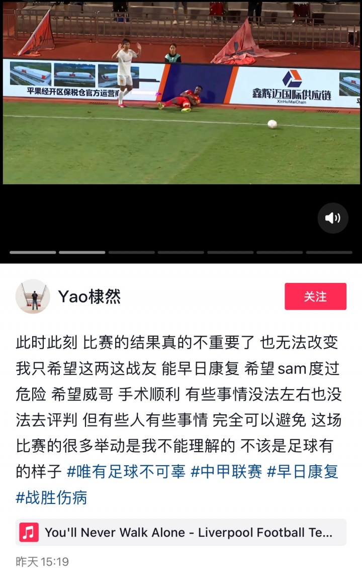 在社交媒体上,广西平果的姚棣然分享了他的感受。他说道:“此时此刻,比赛的结果无需再提,也无从改变。我只是默默希望这两位战友能够早日康复,期盼Sam能够平安渡过这个难关,祝愿威哥的手术能顺利进行。”在他看来,某些事件是无法左右的,而有些则是本可以避免的伤害。他表达的困惑在于:为何比赛中出现了如此许多无法理解的举动,这些并不是足球该有的样子。