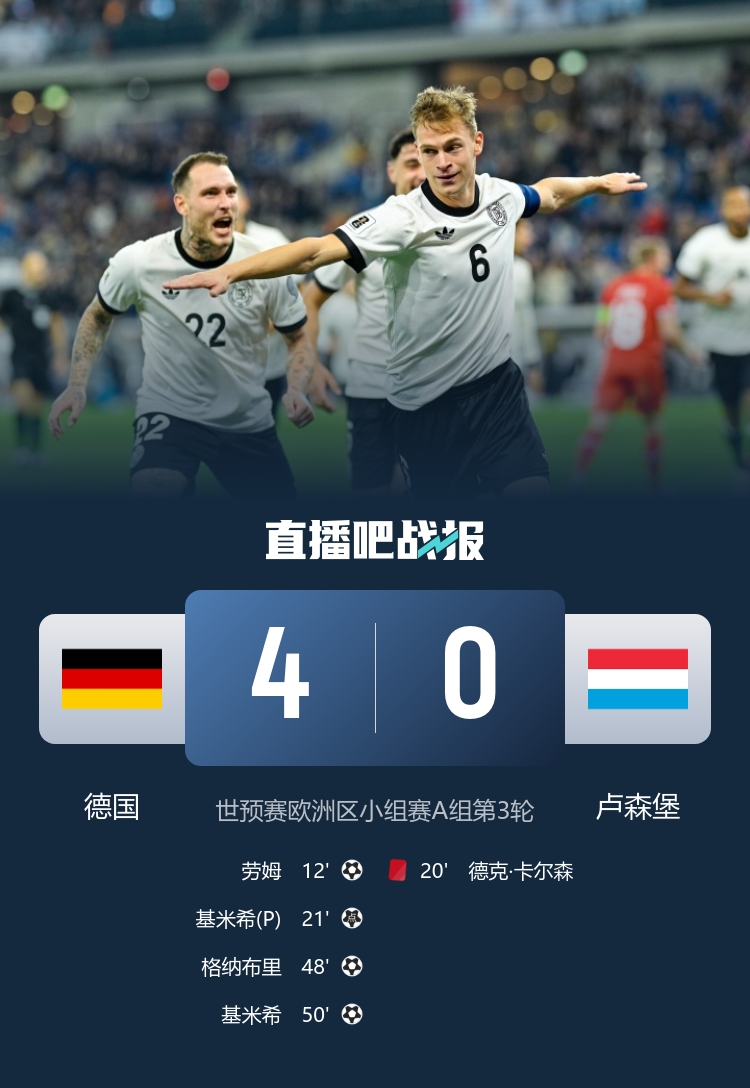 在2023年10月11日凌晨2:45,世预赛欧洲区A组的第三轮比赛中,德国队在伊杜纳信号公园球场迎战来了卢森堡队。上半场开始不久,沃尔特马德的进球被判无效。此后,德国队劳姆在前场直接任意球攻门,球越过防线直入近角,卢森堡的门将莫里斯无法做出反应,德国队率先打破僵局,取得1-0的领先。