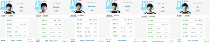 不过,BLG的其他选手显然需要更多的努力。比如knight,尽管他是幸运地排在大师110,但周场次只有23,月场次也仅有49,状态令人担忧。而Elk的情况则更加捉襟见肘,排位在钻石1,近期的周场次只有11,月场次为39,显然是队伍的一大短板。ON在宗师458的段位下,周场次还算可观,有15场,但月场次仅为44,表现波动。