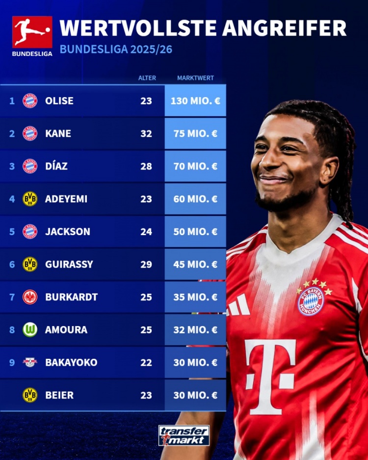 多特蒙德的阿德耶米以6000万欧元位列第四,他在进攻端的活跃表现让他在转会市场上受到关注。而尼古拉斯-杰克逊同样来自拜仁,以5000万欧元的身价排在第五名,进一步巩固了拜仁在德甲的统治地位。
