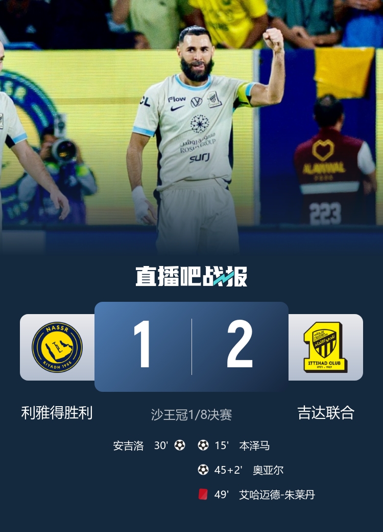 比赛开局,第15分钟,吉达联合迅速占据上风。在一次酝酿已久的反击中,迪亚比右路斜传到禁区,巴西射手本泽马冷静推射,帮助吉达联合率先取得了领先,利雅得胜利0-1落后。