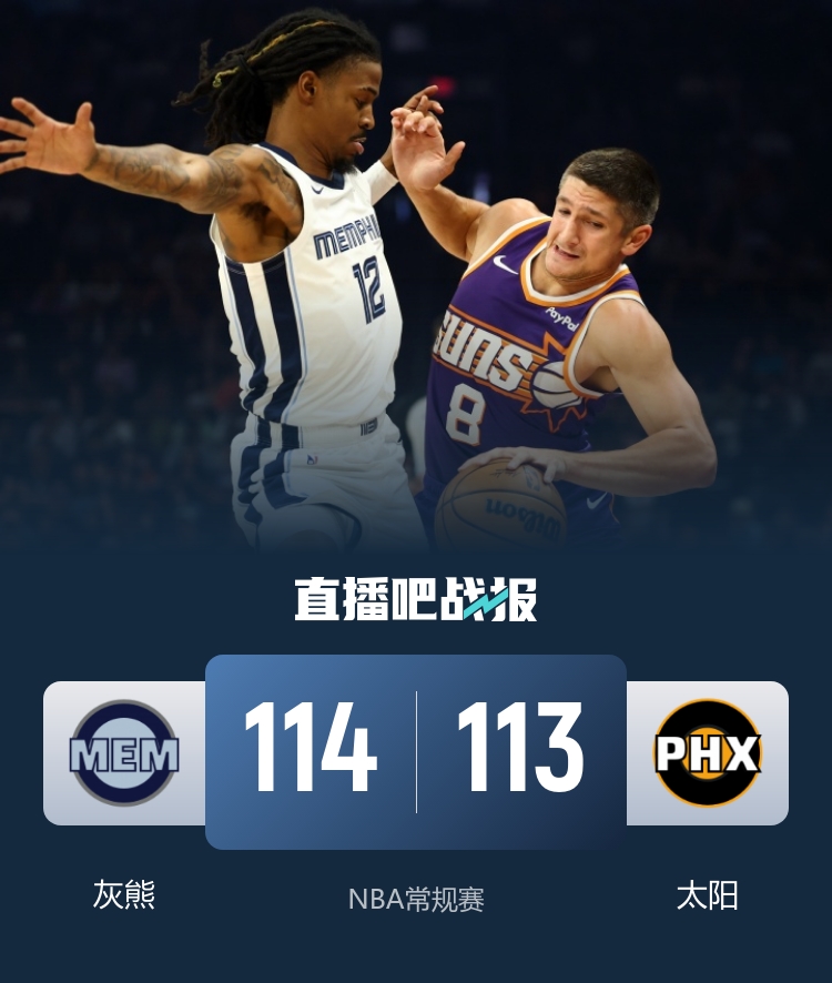 下半场开始后,布克迅速爆发,独得13分,虽然灰熊在此时及时调整状态,稳住了局势,第三节结束时依旧以微弱的3分优势领先。进入关键的最后一节,两队展开了激烈的拉锯战。马威的暴扣帮助太阳实现反超,然而,莫兰特的关键跳投又一次将灰熊送回领先的位置。最后时刻,布克尝试了一记超远三分但未能命中。最终,灰熊以114-113的惊险比分战胜太阳,送给对手四连败。