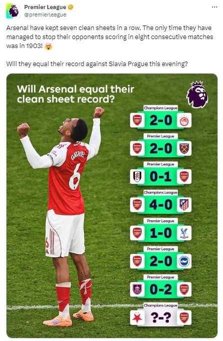 在即将于11月5日凌晨1:45进行的欧冠联赛第4轮较量中,阿森纳将奔赴布拉格,向斯拉维亚发起挑战。如果他们在这场比拼中能够成功零封对手,将自豪地追平一个长达122年的历史纪录。