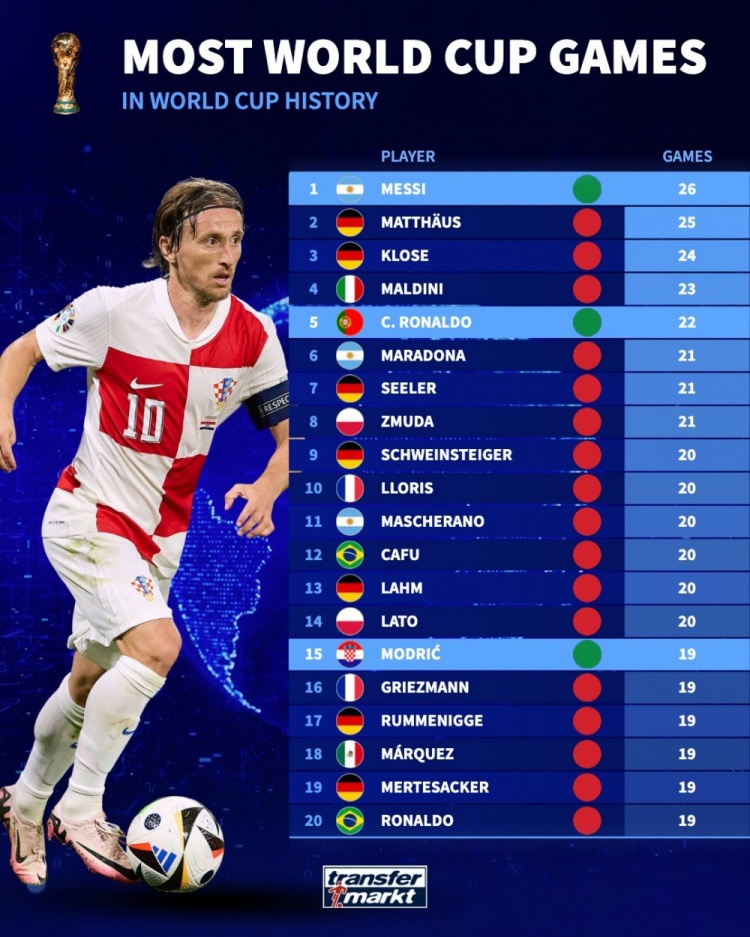 克罗地亚成功晋级世界杯,老将莫德里奇即将迎来第五次参与这一盛事的机会。根据德国转会市场的数据,这位中场大师已经在世界杯的赛场上出场19次,位列历史出场次数榜单的第14位。此榜单显示,阿根廷球星梅西以26场荣登第一,紧随其后的是德国的马特乌斯(25场)和克洛泽(24场)。这些数据不仅彰显了球员在世界杯历史上的出场成就,更反映了他们在国家队的贡献和重要性。