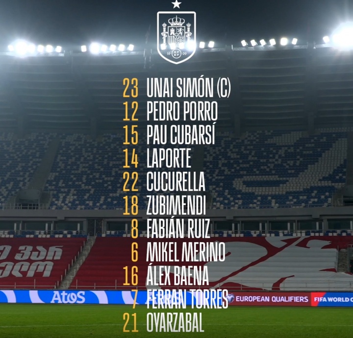 在即将到来的世界杯欧洲区预选赛E组第5轮较量中,将于11月16日凌晨1:00进行的比赛中,格鲁吉亚队将迎战西班牙队。赛前西班牙先行发布了首发阵容,尽管佩德里、亚马尔等队员因伤缺席,费兰和奥亚萨瓦尔将有幸获得首发机会。而格鲁吉亚方面,球星克瓦拉茨赫利亚也会在比赛中登场。