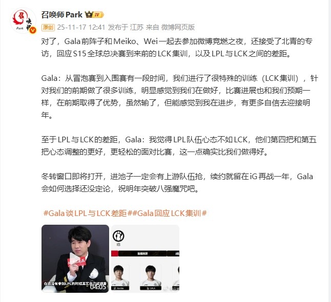 最近,Gala与Meiko、Wei一同出席了微博的“竞燃之夜”活动,并且接受了《北青》的专访。在采访中,他谈到了即将到来的S15全球总决赛的准备情况,以及LPL与LCK之间的竞争差距。