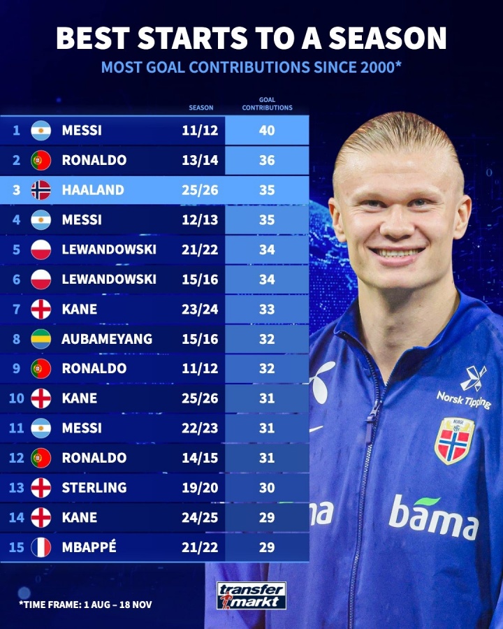 根据德转的统计数据,近几个赛季中,进球表现仍风靡全球,哈兰德以25/26赛季的35粒进球,位列本世纪开赛以来的进球贡献榜第三,在这历史的长河中,他的表现可谓熠熠生辉。古往今来,足球场上的追逐者,常常在看似微不足道的瞬间,创造出令人瞩目的传奇。梅西与C罗无疑是这一伟大诗篇的掌控者,在他们的职业生涯中,赛季初期的火热表现,更为后续的传奇铺平了道路。