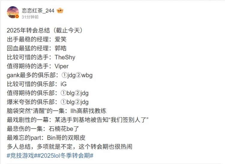 11月22日讯,圈内人士“恋恋红茶”对LPL转会期的动向进行了总结,以下是一些重要反馈: