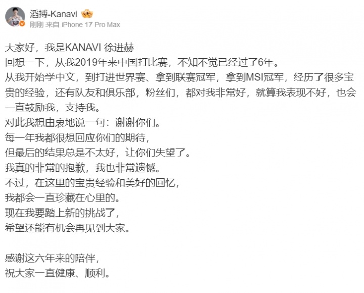 大家好,我是KANAVI 徐进赫。回望2019年我来到中国参加比赛,转眼间已经六年过去了。这段时间,包含我学习中文的过程、参加世界赛的经历、赢得联赛冠军和MSI冠军,这些都让我收获了许多宝贵的经验。同时,队友、俱乐部以及粉丝们都给予了我极大的支持和鼓励。即使我有时表现不佳,你们依然不离不弃,这让我倍感温暖,在此我想说一声:谢谢你们。