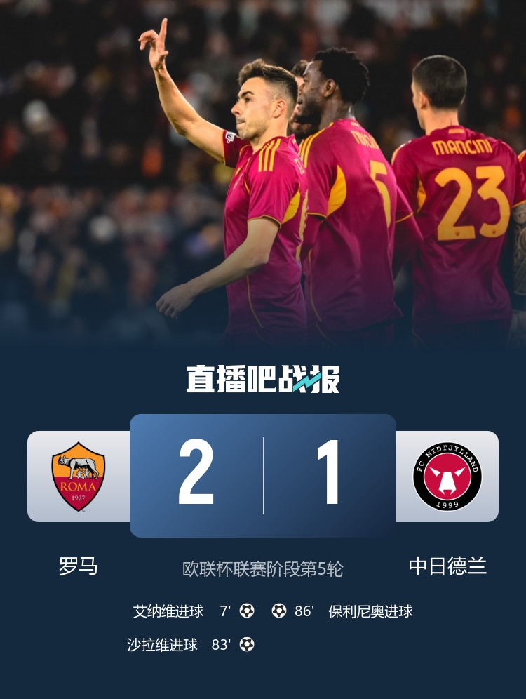 在北京时间11月28日凌晨1:45进行的欧联杯小组赛中,罗马主场迎战中日德兰,最终以2-1获胜,继续保持良好的战绩。上半场,罗马凭借切利克的助攻,艾纳维在第7分钟送入先手,将比分改写为1-0。此后,科内因伤被迫离场,给罗马的阵容带来一定影响。半场结束,罗马以1-0领先对手。