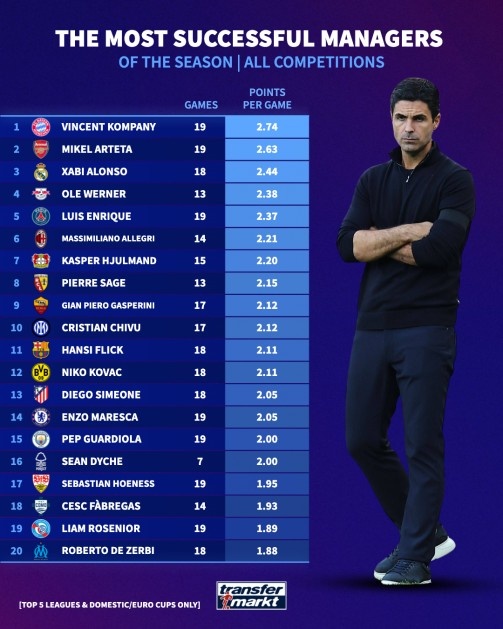 11月28日讯 本赛季的五大联赛中,拜仁慕尼黑与阿森纳表现尤为突出。德国转会市场对各大联赛教练的场均积分进行了统计,拜仁主帅孔帕尼、阿森纳主帅阿尔特塔以及皇马的阿隆索名列前三。值得注意的是,这三位教练都是相对年轻且颇具潜力的少壮派代表。