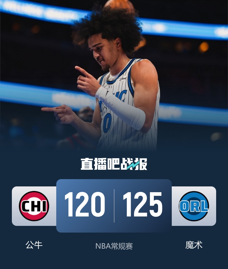 最后一节比赛,双方依旧难分高下。吉迪在关键时刻为公牛拿到微弱优势,然而魔术的贝恩不甘示弱,通过一记三分球帮助球队实现反超。魔术随后打出8-0的小高潮,逐渐建立起领先优势。尽管公牛全力追分,但最终未能逆转局势,魔术在客场以125-120战胜公牛,取得三连胜,而公牛则遭遇四连败。
