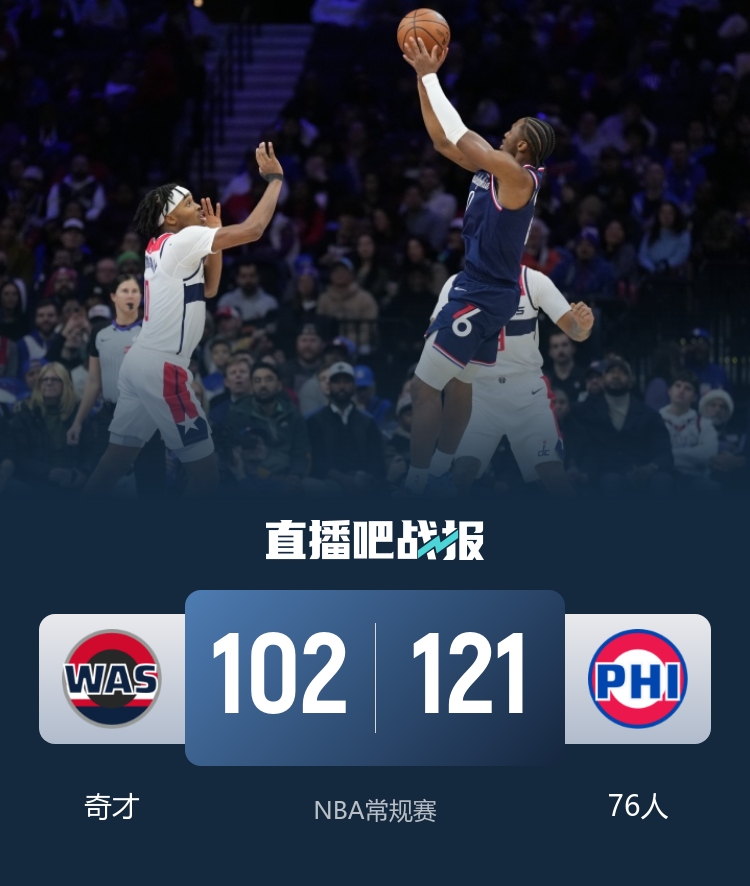 易边再战,马克西状态火热,单节独得20分,帮助76人迅速将分差扩大至20分以上。末节,76人乘势而上,打出14-3的攻击波,优势瞬间扩大至35分,奇才无力回天,最终以121-102败北,76人顺利取得胜利。
