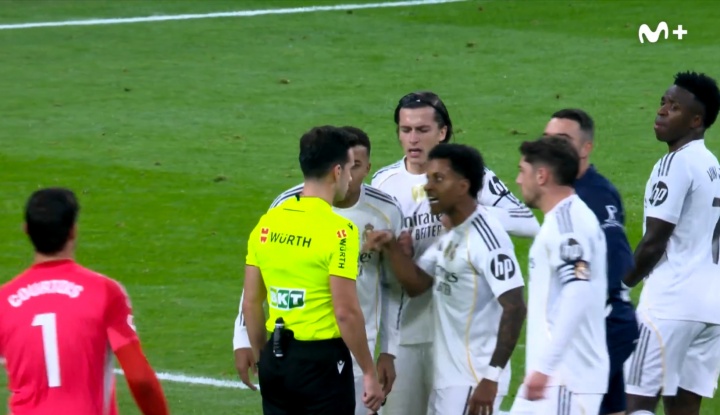12月9日讯,在这一轮的西甲联赛中,皇家马德里在主场以0-2不敌塞尔塔,比赛中出现了引人注目的情况。当时,卡雷拉斯因犯规被裁判红牌罚下,转播公司Movistar捕捉到了皇马球员们向裁判表达不满的激烈情景。
