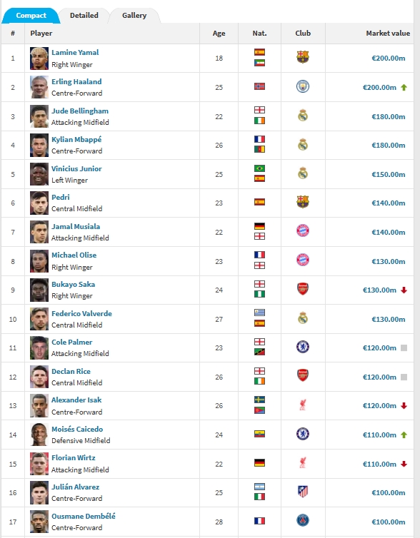 在西甲方面,巴萨的亚马尔以2亿欧元跻身榜首,佩德里则以1.4亿紧随其后;皇马的贝林厄姆和姆巴佩并列1.8亿,另外维尼修斯和巴尔韦德也展现了高昂的身价,分别是1.5亿和1.3亿;马竞的阿尔瓦雷斯也拿下1亿欧元的身价。