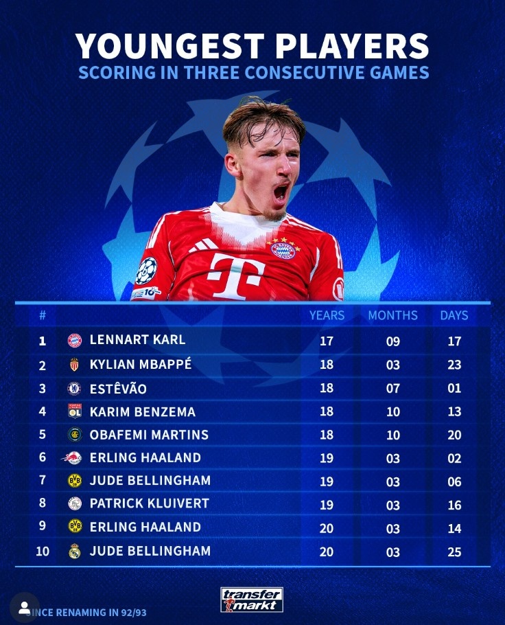 那么,看看这份自92/93赛季以来的纪录榜单吧,卡尔以17岁9月17天的完美数字占据了第一,这成就简直让人怀疑他是不是吃了长生不老药。相比之下,位居第二的姆巴佩虽然也神勇,但却已经18岁3个月,这简直是“高龄”,要知道,年轻可是这场比赛的主题!