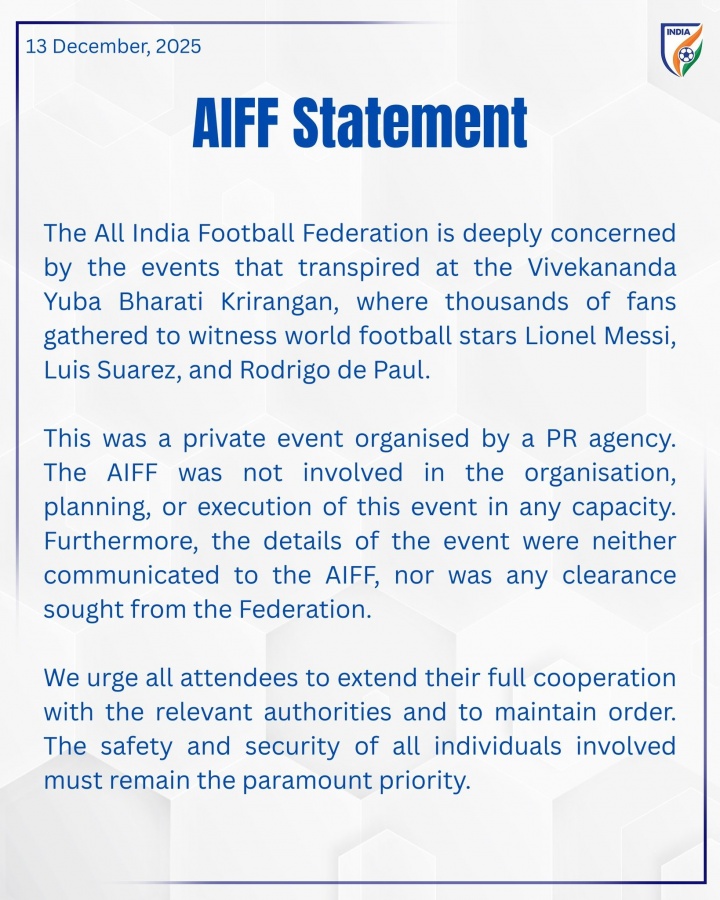 印度足协发布声明,针对此前在盐湖体育场发生的事件表示高度关注。现场吸引了数万球迷前来观看梅西、路易斯·苏亚雷斯和德保罗等足球明星的活动。然而,足协明确指出,此次活动是由一家公关公司单独策划和组织的,足协并未参与活动的任何组织、筹备或执行。此外,也没有相关方将活动细节告知足协,活动同样没有申请任何审批许可。