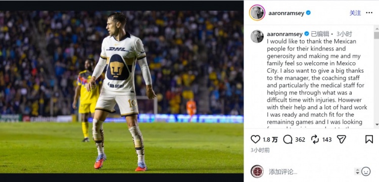 拉姆塞的发言不仅展现了对美洲狮俱乐部的感激之情,还流露出对自己未来的期待。他期待继续在职业生涯上追求新的机会,同时也意识到与墨西哥的告别并不是结束,而是一个新的开始。这条动态反映了他对过去经历的珍视以及对未来的希望,尤其是他与所在俱乐部及球迷之间的情感连接。尽管现阶段结束了与美洲狮的合作,拉姆塞仍对这个阶段充满感激,并希望将来有机会再度回归此地。