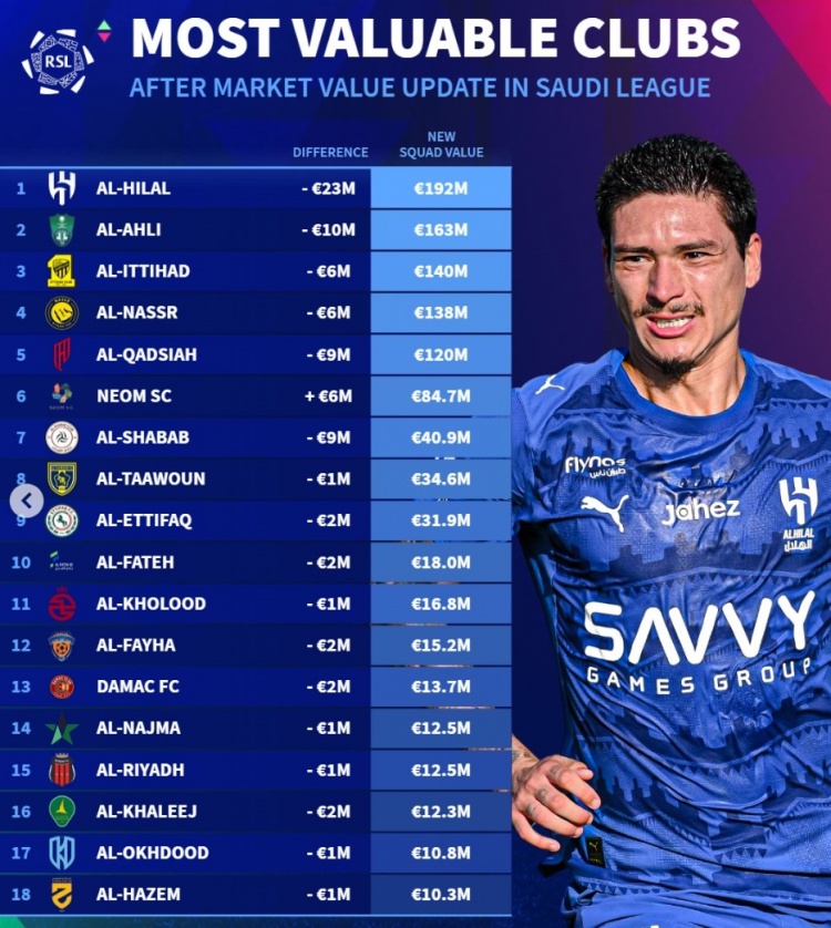 在这片激动人心的土地上,沙特足球正在书写着新的辉煌篇章。根据最新的《转会市场》数据显示,沙特球员的市场身价有了显著的提升,五支球队的总身价已成功突破一个亿的里程碑,令人瞩目。
