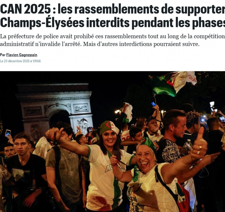 根据《巴黎人报》的报道,巴黎警方决定在1月1日凌晨两点之前禁止球迷在香榭丽舍大道聚集。这项禁令早已于12月21日生效,并将持续到1月19日,期间恰逢非洲杯赛事。