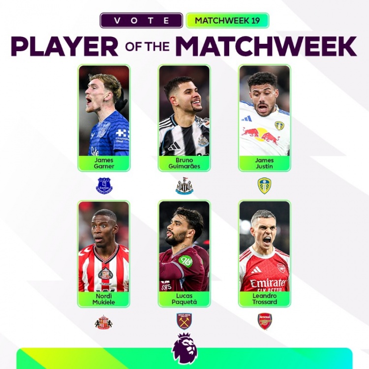 英超联赛在第19轮的较量中,璀璨球星们的表现令人瞩目。今天,英超官方发布了本轮最佳球员候选名单,入围的六位球员正是各自球队的灵魂与希望。他们分别是詹姆斯·加纳、布鲁诺·吉马良斯、詹姆斯·贾斯汀、穆基勒、帕奎塔和特罗萨德。这些选手在比赛中展现了过人的技术和无畏的拼搏精神。