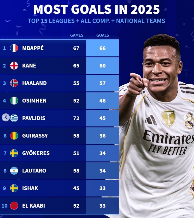 2025年已经过去,根据《转会市场》的统计数据,前15大联赛的球员在俱乐部和国家队的各项赛事中总进球情况揭晓,皇马的前锋姆巴佩以66球位居射手榜首位。