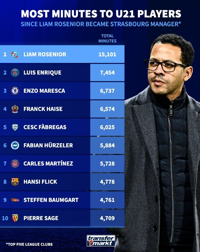 罗塞尼尔,这位新晋切尔西主帅,刚一到位就引发了关注,似乎他的执教理念就是要把U21的年轻球员练成全能战士。从他在斯特拉斯堡执教期间的表现来看,他在五大联赛中的领导能力几乎无人能及,数据上他独占鳌头,真是让其他教练羞愧得无地自容。15101分钟,没错,就是这个华丽的数据,简直让人怀疑他是在当年轻球员的“训练大使”。