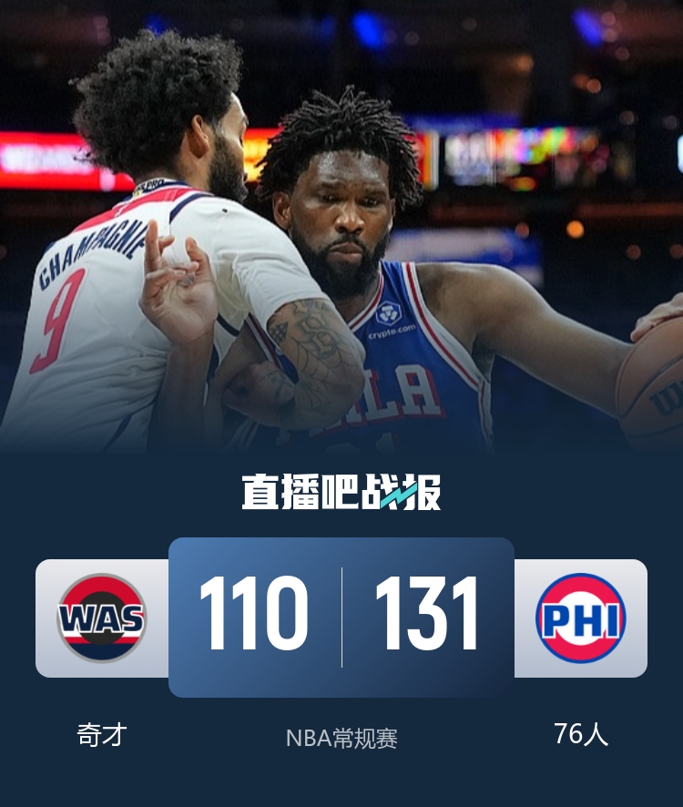 在球员数据方面,76人的恩比德砍下28分7篮板2助攻2盖帽,乔治贡献23分4篮板5助攻,马克西则有22分3篮板8助攻入账。奇才的特雷·约翰逊表现不俗,得到20分5篮板3助攻,卡林顿也拿下了18分3篮板7助攻。整场比赛,76人在攻防两端的表现相对均衡,而奇才虽有亮点,但整体实力差距明显。