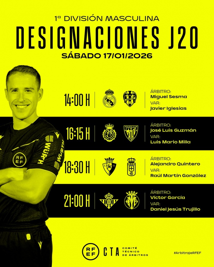 1月16日讯 本周末,西甲联赛将进入第20轮,西班牙足协已公布部分比赛的裁判安排。皇马将在主场迎战莱万特,此役由米格尔·塞斯马执法。