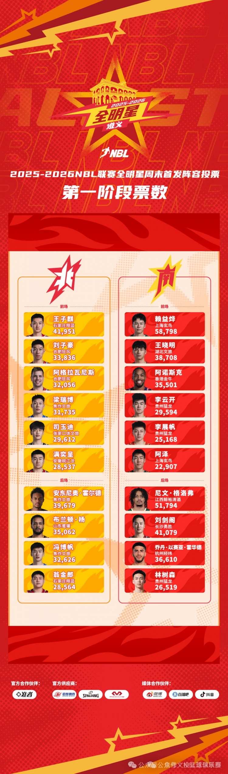 2025-2026 NBL联赛全明星周末首发阵容投票第一阶段的计票结果现已公布。焦作文旅的三位优秀球员在北区榜单上表现出色,凭借他们卓越的实力赢得了全网球迷的认可与支持。