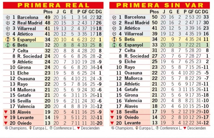 1月20日讯 《阿斯报》最新统计显示,如果西甲没有VAR这个神秘的“天使”,巴萨的积分岂不直接暴涨1分,而皇家马德里更是可以如愿多捞2分,最终让这两队在争夺中同积50分,真是一场“和平”共处的奇妙剧集。