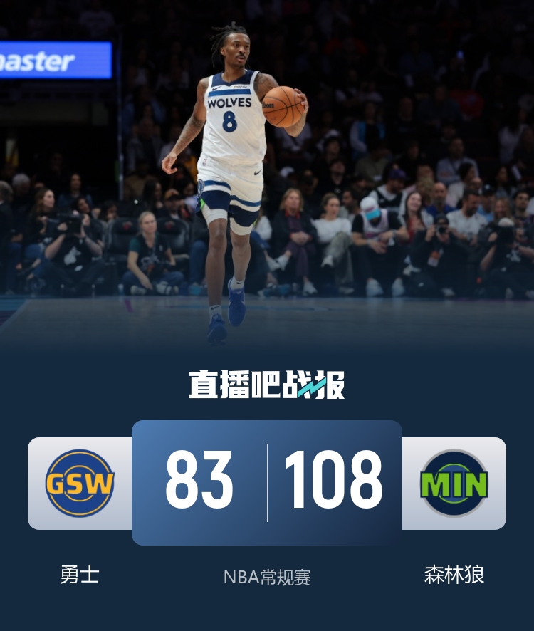 易边再战,勇士继续在进攻上挣扎,未能有效追分。森林狼则稳扎稳打,不断扩大领先优势,第三节结束时,他们已经领先18分。进入最后一节,勇士无力再现反扑之势,比赛的悬念也随之消失。最终,森林狼以108-83大胜勇士,成功终结自己的五连败。