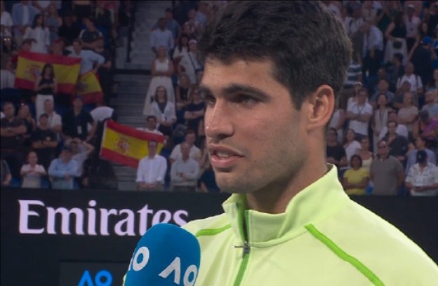 1月30日讯,在一场紧张激烈的比赛中,阿尔卡拉斯以3-2战胜了兹维列夫,成功晋级澳网决赛。赛后,他在场边接受了采访。