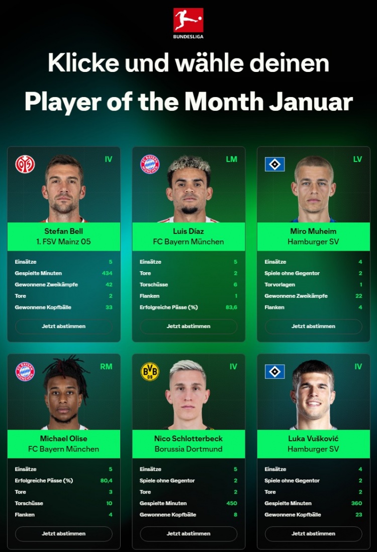 在这片足球的热土上,德甲联赛如同一股不可阻挡的潮流,激情与荣耀交织,才俊辈出,英勇奋发。在这个特殊的月份,我们迎来了最耀眼的明星,他们以卓越的表现名列一月最佳球员候选之中。领衔之者包括了奥利塞、路易斯·迪亚斯以及武什科维奇等杰出球员。