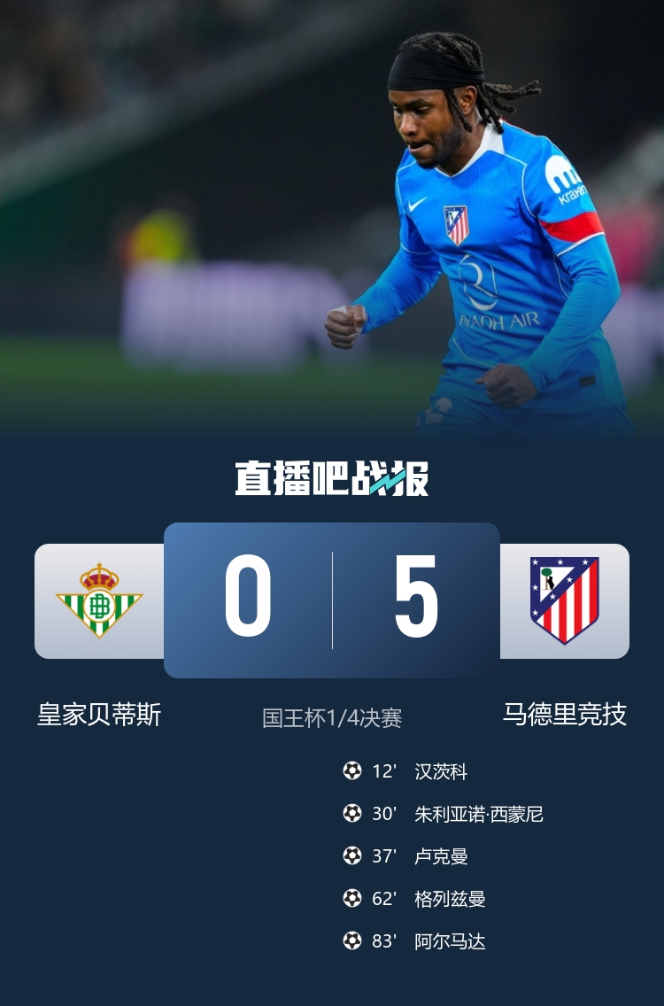 2月6日讯,国王杯1/4决赛中,皇家贝蒂斯主场迎战马德里竞技,比赛在贝尼托比利亚马林球场举行。上半场,马竞凭借汉茨科、小西蒙尼和卢克曼的进球取得领先。下半场,卢克曼助攻格列兹曼得分,阿尔马达也为球队再添一球,最终马德里竞技以5-0完胜贝蒂斯,成功晋级四强。