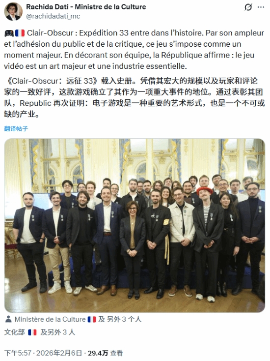最近,法国文化部长拉希达·达蒂在社交媒体上发出了一条重磅消息,让我们看到了游戏行业的“辉煌”。游戏开发商Sandfall Interactive因其大卖的游戏《光与影:33号远征队》获颁法国文化部的艺术与文学勋章。这简直就像是给游戏界的奥斯卡颁了一张通行证,仿佛电视剧的“金球奖”即将落入游戏手中!