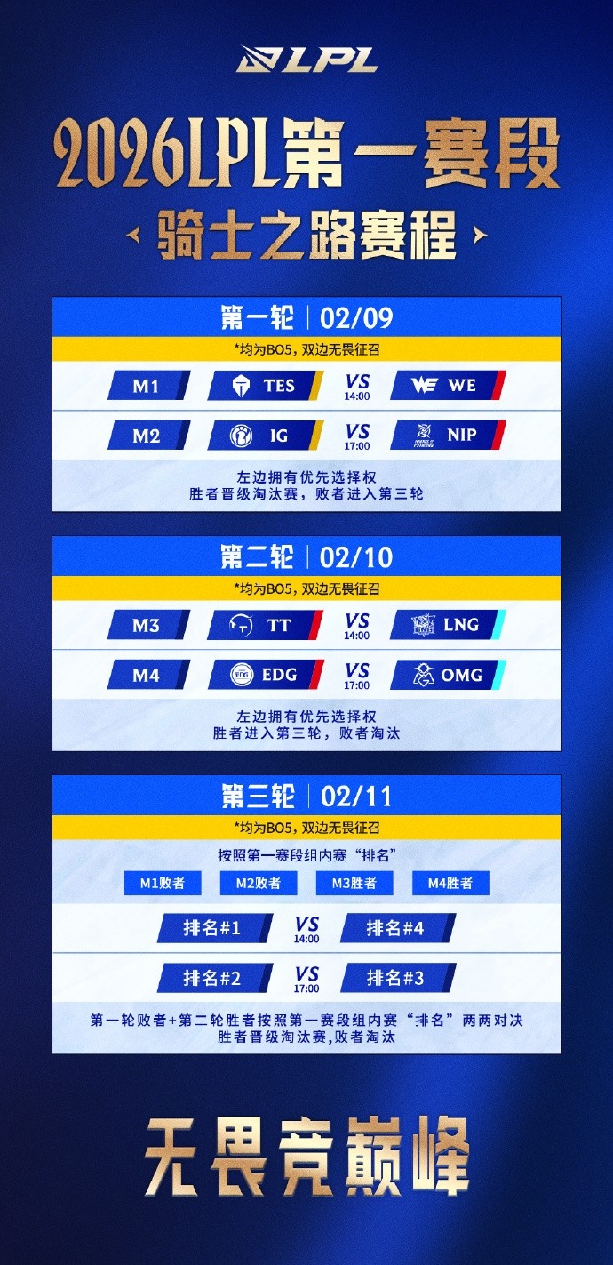 “骑士越千峦,霜剑斩重关”,真正的挑战即将来临!从2月9日到2月11日,2026LPL第一赛段骑士之路将给大家带来无畏的竞技精神与巅峰对决。准备好见证激烈的角逐,谁能在这场巅峰对决中笑傲赛场,书写新的传奇?在接下来的比赛中,精彩瞬间将不断上演,让我们拭目以待!