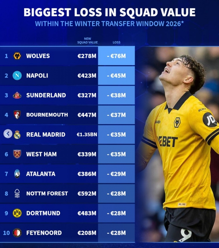 根据《转会市场》的最新统计,各大足球联赛的冬季转会窗口已基本关闭。在这个转会期内,球队的市场价值发生了显著变化,其中狼队的身价降幅最大,达到7600万欧元,当前球队估值为2.78亿欧元。