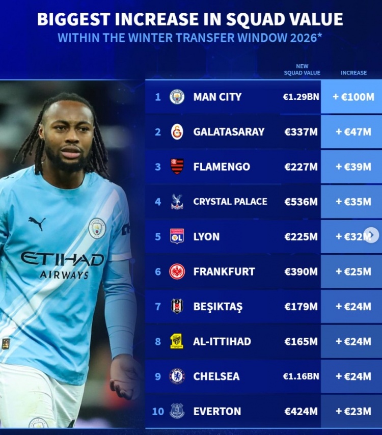 冬季转会窗口的结束为各大俱乐部的阵容调整画上了句号,球队的身价变化也反映了他们在转会市场上的策略和投入。曼城的显著增长显示了其在转会期间的成功操作,其他球队同样在这个窗口中获得了可观的提升。