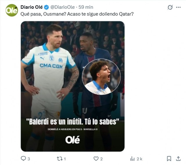 在2月13日的比赛中,巴黎圣日耳曼以5-0的悬殊比分战胜了马赛,比赛期间登贝莱对霍伊别尔的言论被法甲1+频道的镜头捕捉到了。他对阿根廷后卫巴列尔迪的批评引发了热烈讨论,声称“巴列尔迪太烂了!”这一言论瞬间在社交媒体上传播开来,尤其是在巴列尔迪因防守失误而遭遇差评的情况下,比赛结果对马赛来说更显惨痛,甚至导致教练德泽尔比下课。
