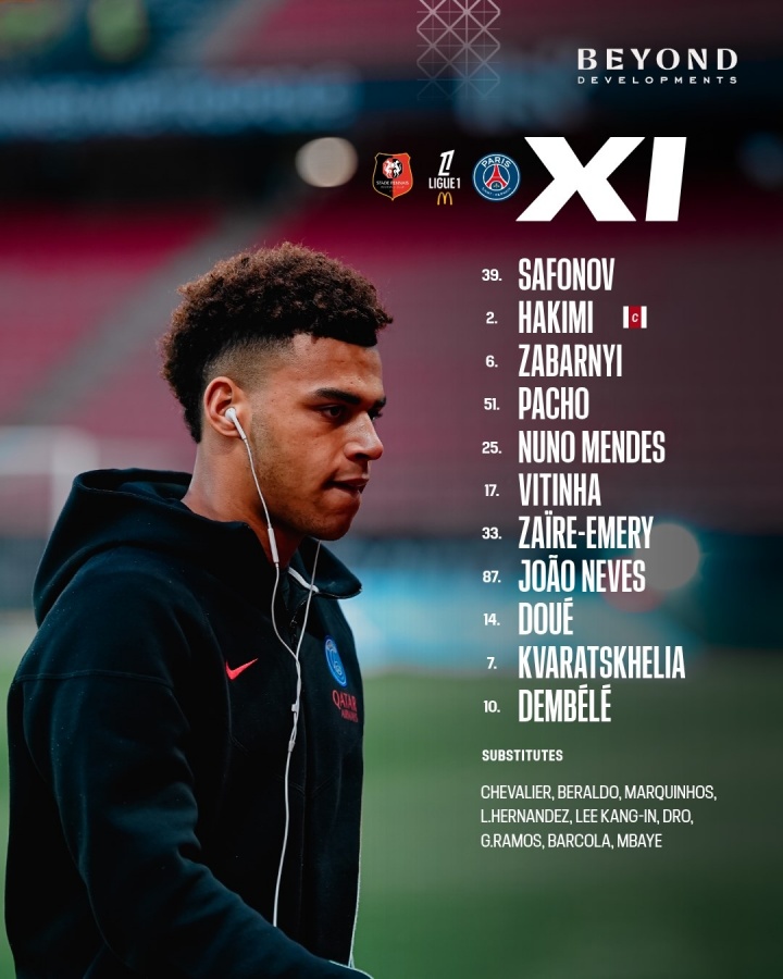 首发球员包括:39号门将萨福诺夫,后卫阿什拉夫、扎巴尔尼、帕乔和努诺·门德斯,中场由维蒂尼亚、扎伊尔·埃梅里和若昂·内维斯组成,前锋阵容则由杜埃、克瓦拉茨赫利亚和登贝莱共同负责。