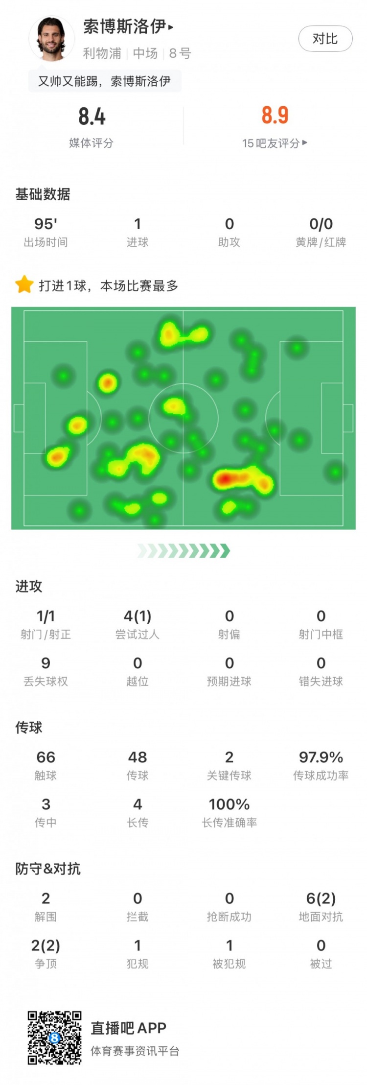 索博斯洛伊的表现相当亮眼,他不仅在进攻端表现突出,还在防守中贡献良多。本场比赛他的传球成功率高达惊人的97.9%,显示出他的精准和稳定。最终,他在评分中获得了8.4分,成为全场第二高的评分,仅次于传奇球星萨拉赫。