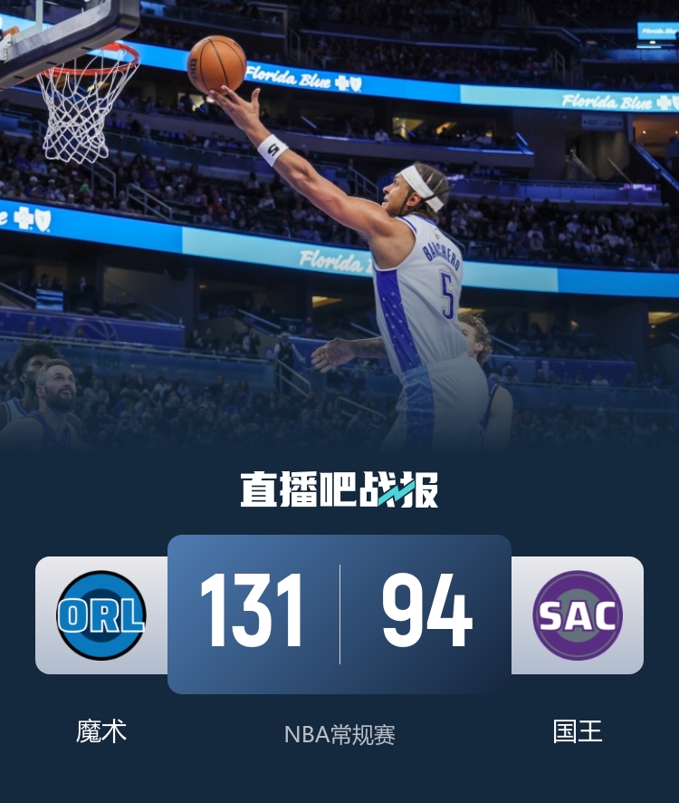 下半场,比赛呈现拉锯战,魔术始终控制着10分左右的领先。最后3分钟,魔术发动一波15-1的攻击潮,将领先优势扩大到18分。末节,魔术通过连中三分球将分差拉开至20分以上,国王无力回天,比赛进入替补阵容的较量后,魔术的领先优势已经扩展到30分以上。最终,魔术以131-94大胜国王。
