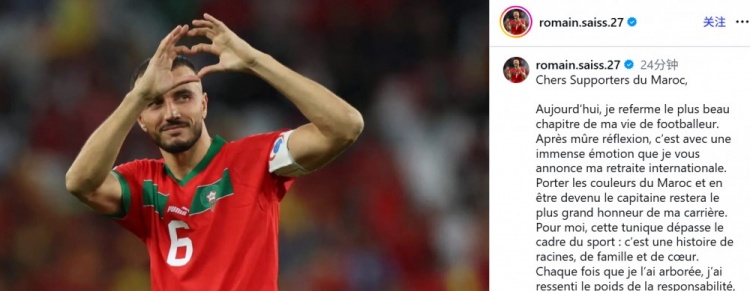 摩洛哥后腰罗曼·赛斯于2月24日在个人社交媒体上宣布,他将正式退役于摩洛哥国家队,结束其辉煌的足球生涯,年满35岁的他作出了这一艰难的决定。