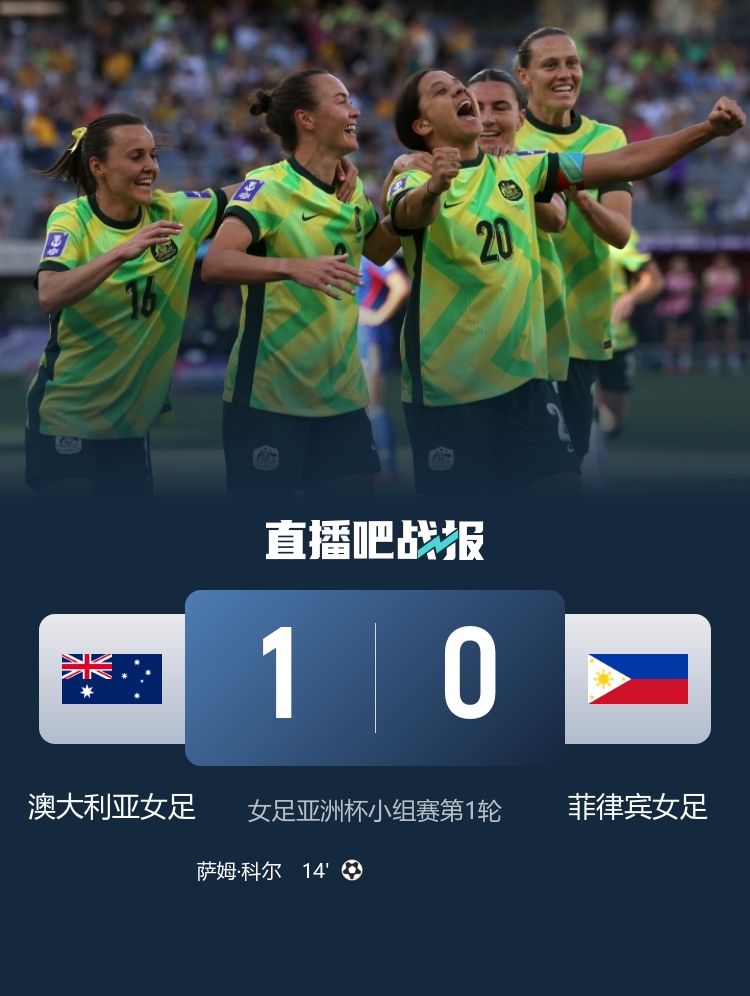 3月1日,女足亚洲杯揭幕战在HBF公园激情上演,特邀澳大利亚女足与菲律宾女足进行较量。比赛的气氛紧张而热烈,吸引了众多球迷的关注。上半场,澳大利亚女足展现出了强大的攻击力,尤其在第13分钟时,惠勒从右路传中,富德巧妙地头球摆渡,为后点的科尔创造了得分机会,科尔毫不犹豫地用头球把球送入了网窝,澳大利亚女足以1-0的优势取得领先。