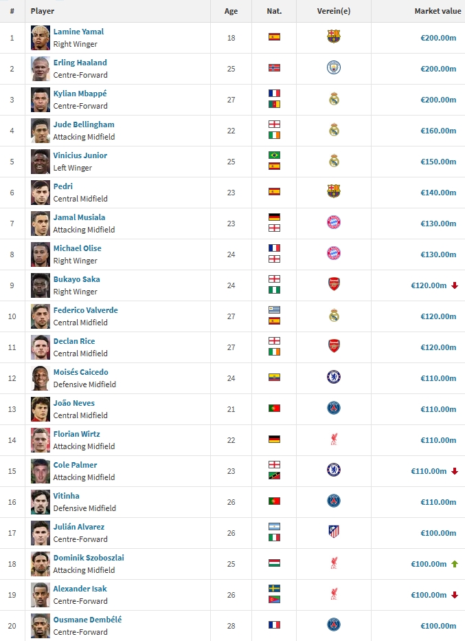 在英超方面,曼城的哈兰德以2亿欧元领跑榜单,其身价令人瞩目。阿森纳的年轻才俊萨卡和赖斯也以各自1.2亿欧元并列第二。而利物浦则在这榜单上展现了其人才储备,伊萨克和索博斯洛伊的身价均为1亿欧元,威尔茨则略高于这两人,达到了1.1亿欧元。此外,切尔西的帕尔默和凯塞多同样以1.1亿欧元的身价入选。
