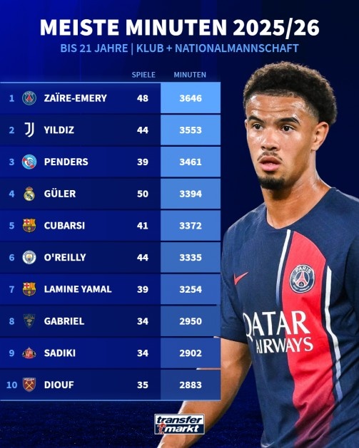 根据Transfermarkt的数据,本赛季五大联赛U21球员的出场时间排行榜上,巴黎圣日耳曼的埃梅里以3646分钟高居榜首。他的出色表现为球队贡献巨大,进一步证明了他在球队中的重要地位。